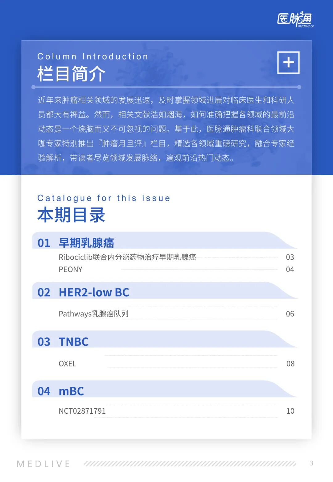 本期《肿瘤月旦评》将聚焦乳腺肿瘤,分别以早期乳腺癌、HER2-低表达乳腺癌、三阴性乳腺癌(TNBC)、转移性乳腺癌(mBC)四个维度为切入点,通过介绍最新研究进展,管窥领域发展动态。