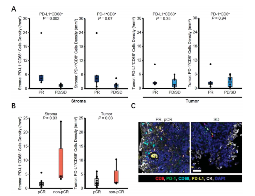 PR患者的间质区域PD-L1+CD68+细胞密度显著高于SD或PD患者(P = 0.002);