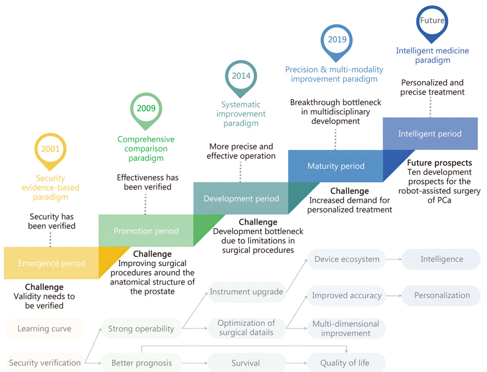 RARP技术历经多次重要迭代,目前正逐步迈向智能化阶段(图1)[3]。该技术具备多项显著优势:搭载卓越的三维视觉系统,可提供高清放大的手术视野,显著提升操作的精细度;机械臂具有超人手部的灵活运动范围,能精准完成血管吻合及神经保护等复杂操作;系统还能消除术者手部