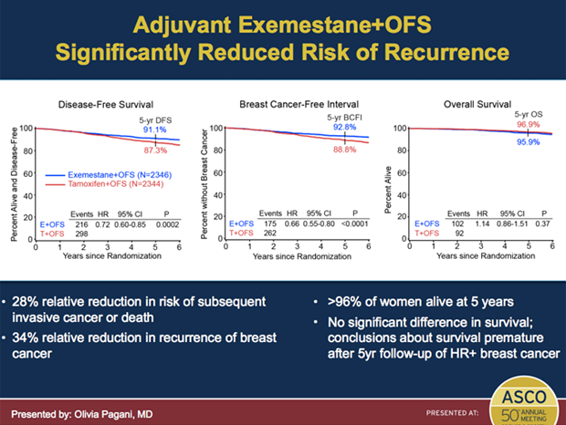 他莫西芬和依西美坦试验(TEXT),以及卵巢功能抑制试验(SOFT)的研究结果表明,在绝经前激素敏感的乳腺癌患者中使用依西美坦联合卵巢功能抑制剂(OFS)会带来乳腺癌复发风险34%的降低,与他莫西芬联合OFS的治疗相比较。经过5.7年,依西美坦治疗的患者浸润性疾病出现28%的降低(P=0.0002)。依西美坦组无疾病存活率为91.1%,对比他莫西芬组的87.3%。研究详情:【ASCO2014】依西美坦与他莫西芬治疗绝经前HR+乳腺癌疗效比较
