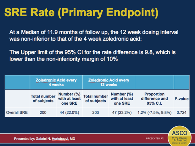 OPTIMIZE-2试验结果显示,每12周给予唑来膦酸,与每4周标准给药方案给药,对乳腺癌骨转移患者一样有效。骨相关事件(SREs)比率在两个治疗组中相似——每4周组:22% vs 每12周组:23.2%(P=0.724)。研究SRE开始时间和平均骨发病率(SMRs)在两个治疗组中也相似(P =0.792和P=0.854)。“每12周给予治疗是安全的,将受到欢迎,”没有参与该项研究的Don S. Dizon教授(Massachusetts General医院癌症中心)说。研究详情:【ASCO2014】唑来膦酸延续治疗乳腺癌骨转移:每4周还是每12周?