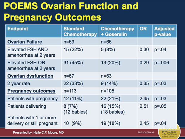 使用促性腺激素释放激素激动剂戈舍瑞林同时化疗可以保留早期乳腺癌患者的生育能力,保护卵巢免受化疗损害。该研究也证实给予戈舍瑞林的女性可以提高总生存期和无疾病生存期。按照该研究作者的观点,女性开始化疗应该这种新选项以预防在癌症治疗过程中卵巢早衰。这项研究纳入257名绝经前女性,由美国国立卫生研究院赞助。研究详情:【ASCO2014】重磅研究:乳腺癌戈舍瑞林+标准化疗保留生育力