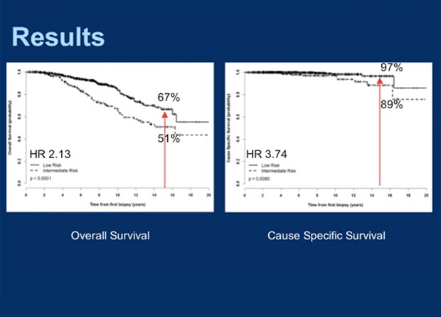 幻灯片3:对中危前列腺癌行主动监测可能会减少男性的生存期。与低危前列腺癌患者相比,主动监测的中危患者有几乎四倍的几率在15年内死于前列腺癌。中危前列腺癌患者10年和15年总生存(OS)率分别为68.4%和50.3%。低危前列腺癌患者10年和15年生存率分别为83.6%和68.8%。这项前瞻性研究分析了945例前列腺癌患者,其中中危患者237例,低危患者708例。中危是指患者血前列腺特异性抗原(PSA)水平大于10,Gleason评分7分,或临床分期为T2b / 2C。[ 3 ](图片来源:D. Andrew Loblaw,,医学博士,加拿大多伦多市Sunnybrook健康科学中心。)