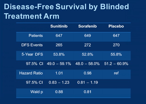 4. Haas NB, Manola J, Uzzo RG, et al. Initial results from ASSURE (E2805): Adjuvant sorafenib or sunitinib for unfavorable renal carcinoma, an ECOG-ACRIN-led, NCTN phase III trial. Presented at the 2015 Genitourinary Cancers Symposium. Abstract 403.