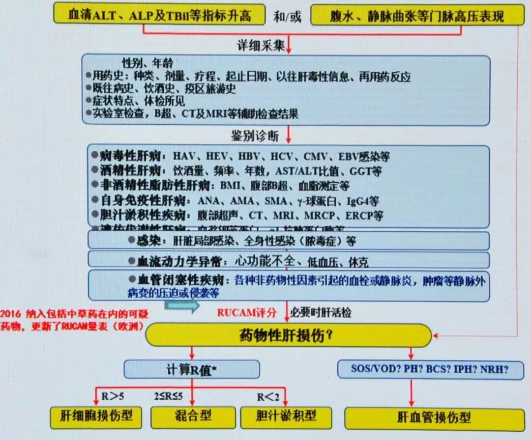 DILI诊断流程图(见图3):排他性诊断、RUCAM量表、必要时肝活检